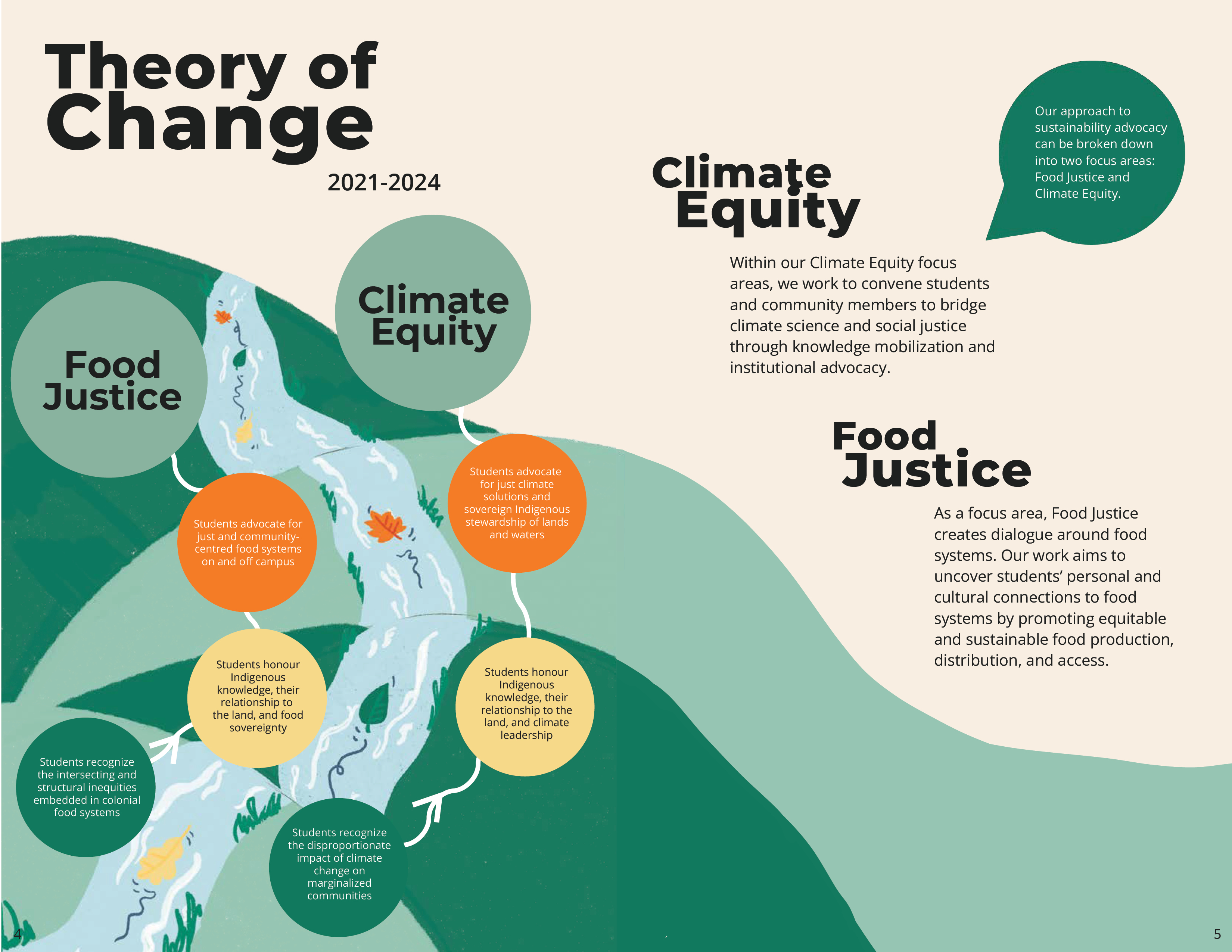 Updating the existing theory of change design, an illustrated river metaphor, into a simplified explainer that can be understood at a glance.